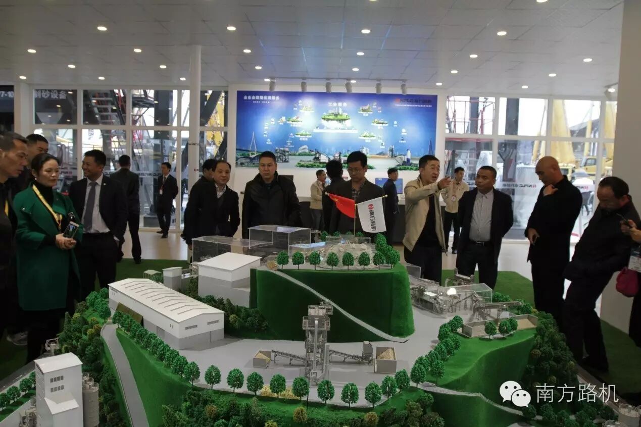 一楼大厅的南方路机整体解决方案体验区,向客户展示了南方路机集破碎、整形、制砂、搅拌、建筑垃圾处理的绿色建材循环产业整体解决方案。