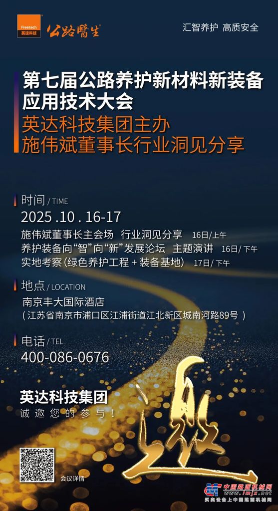 由中国公路学会养护与管理分会与英达科技集团联合主办的【第七届公路养护新材料新装备应用技术大会】将于2025年10月16-17日在南京隆重举行!